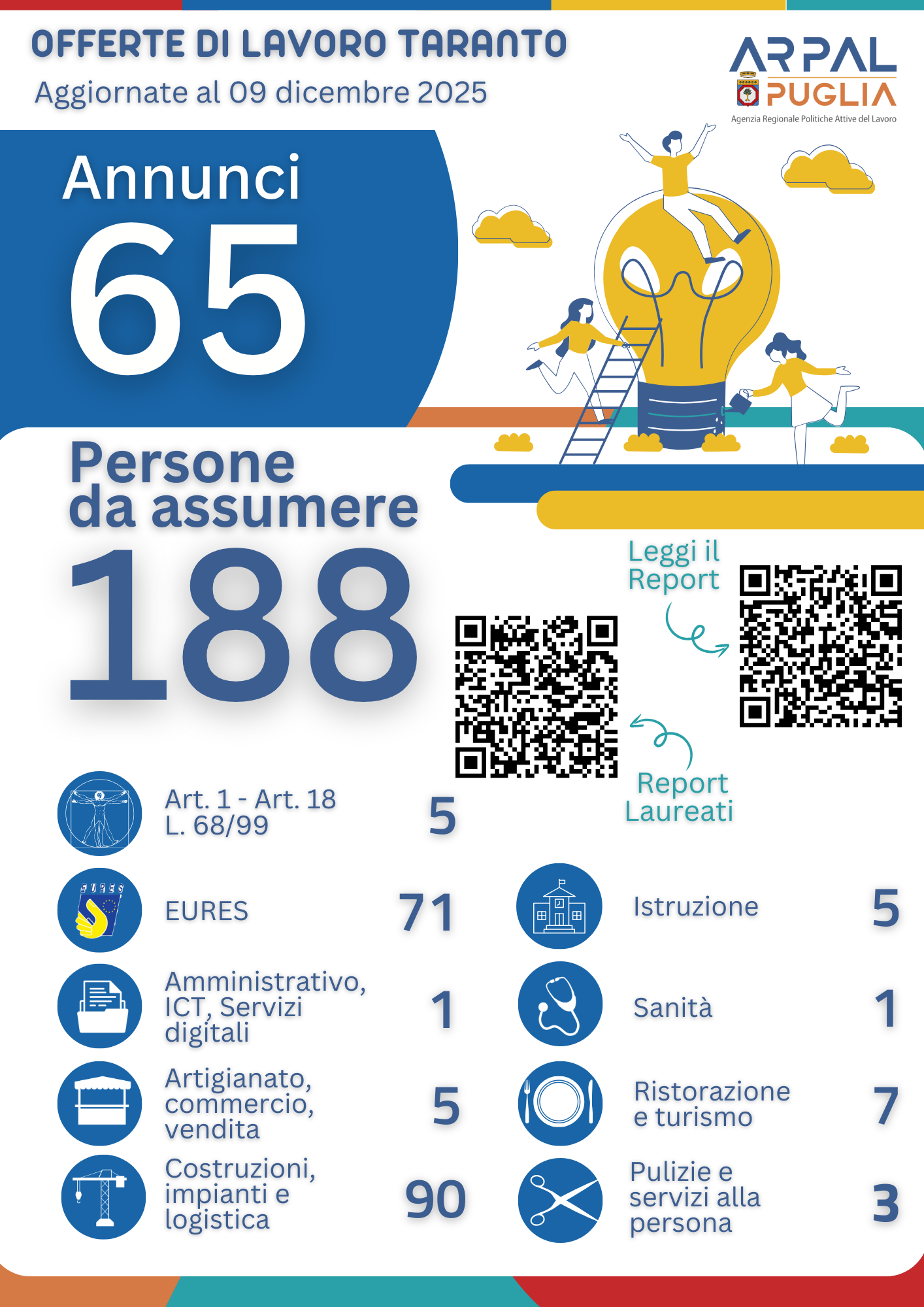 In questa sezione è possibile consultare i Report periodici sulle offerte di lavoro disponibili nella provincia di Taranto, in Italia e all'estero, suddivise nei vari settori lavorativi.