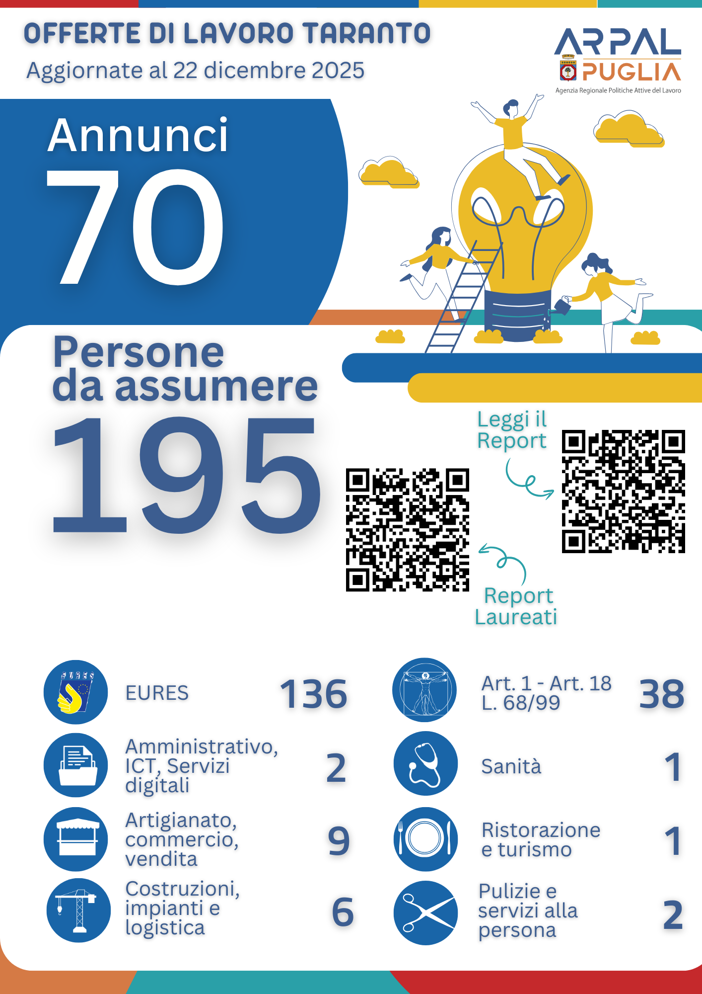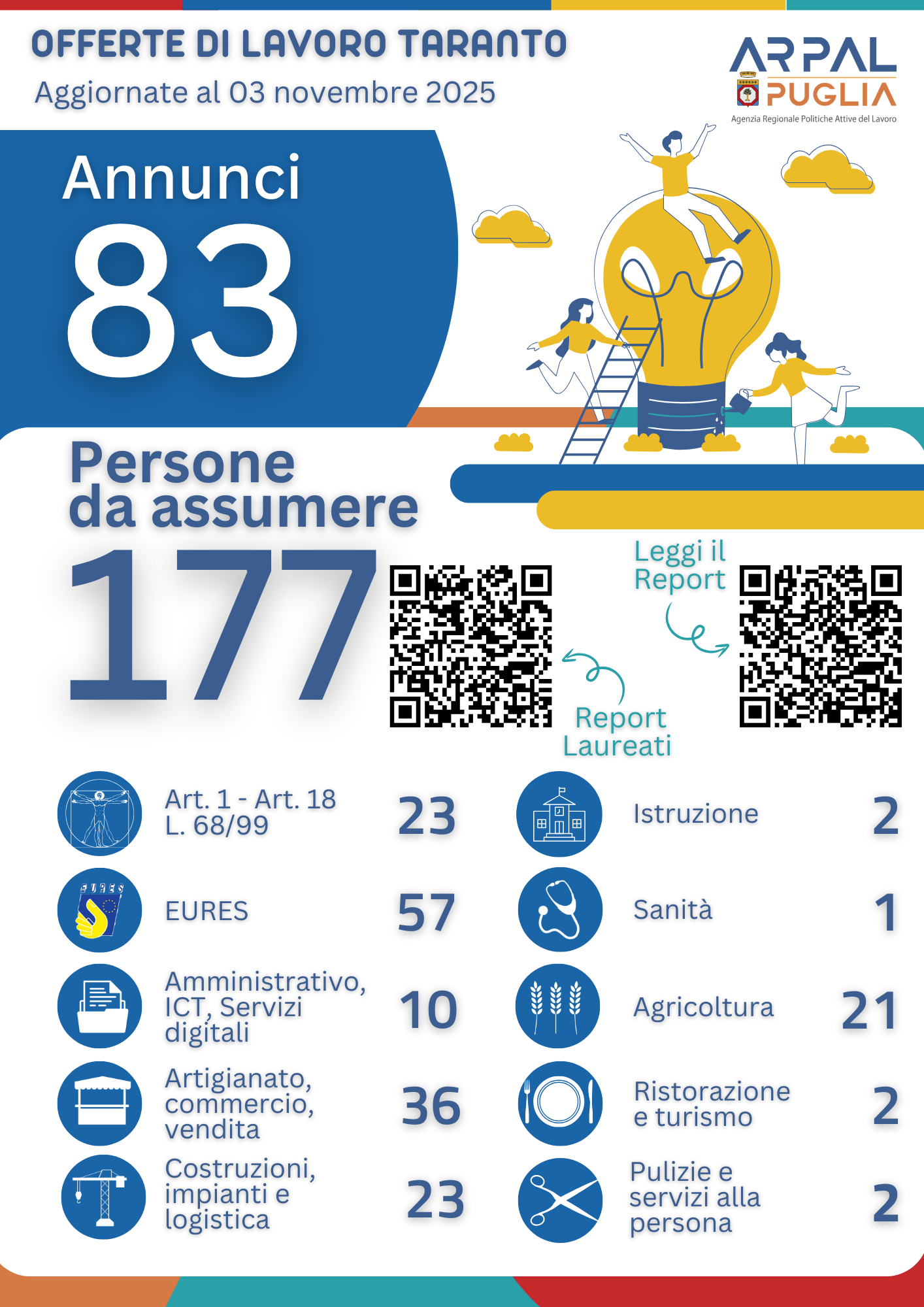 In questa sezione è possibile consultare i Report periodici sulle offerte di lavoro disponibili nella provincia di Taranto, in Italia e all'estero, suddivise nei vari settori lavorativi.